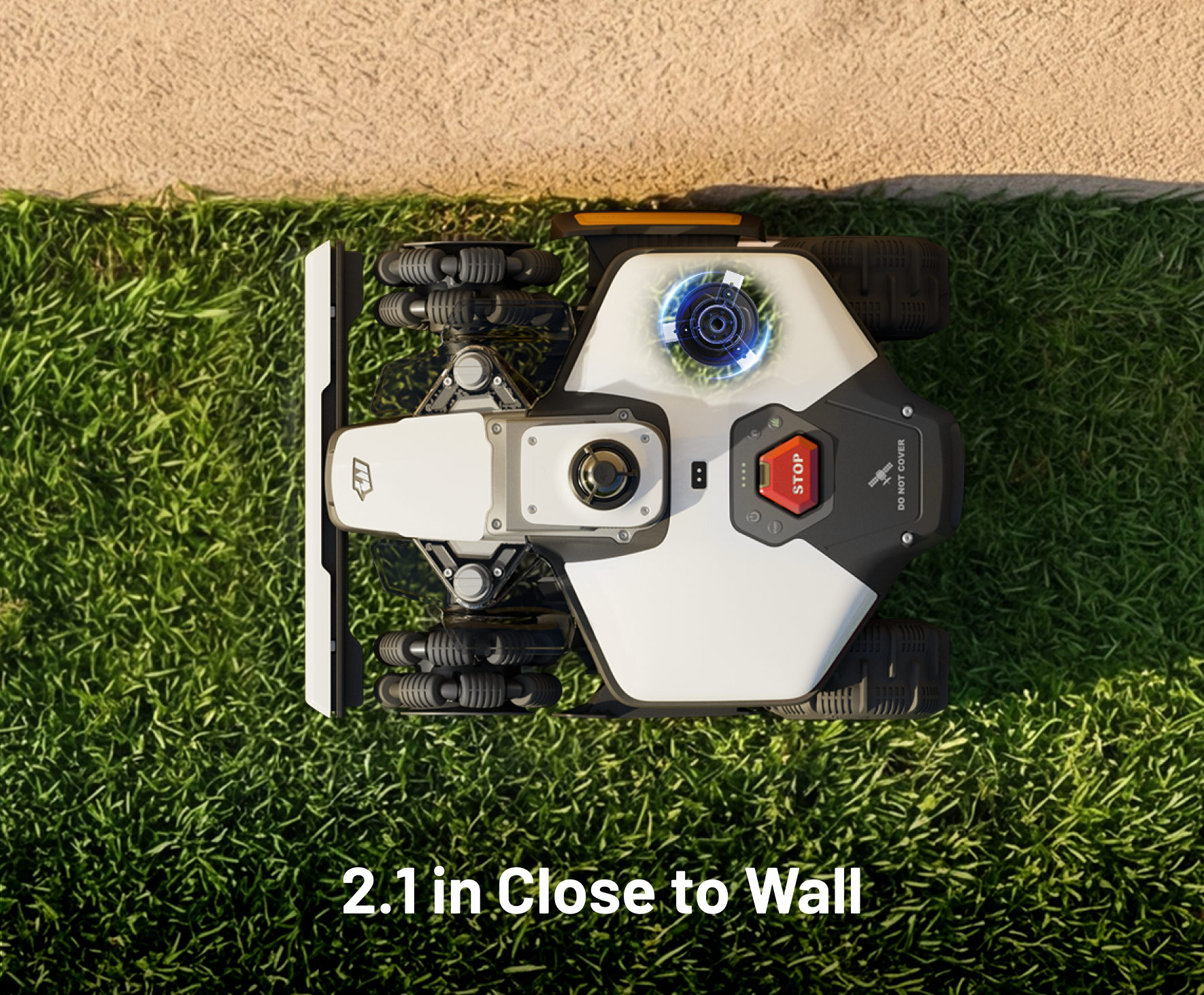 The fixed 4.7 in edge cutting disc ensures LUBA mini 2 AWD can mow up to approximately 2.1 in from walls safely, delivering precise edge trimming. When it rides along the edge, the edge disc ensures an even cleaner and more uniform finish.